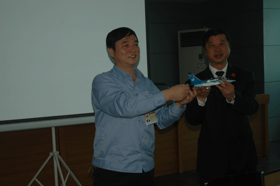 參觀考察結束時,洪都集團黨委副書記、工會主席車德云同志代表洪都集團向仁和集團贈送了“獵鷹”飛機模型,祝愿仁和集團展翅高飛,再鑄輝煌。